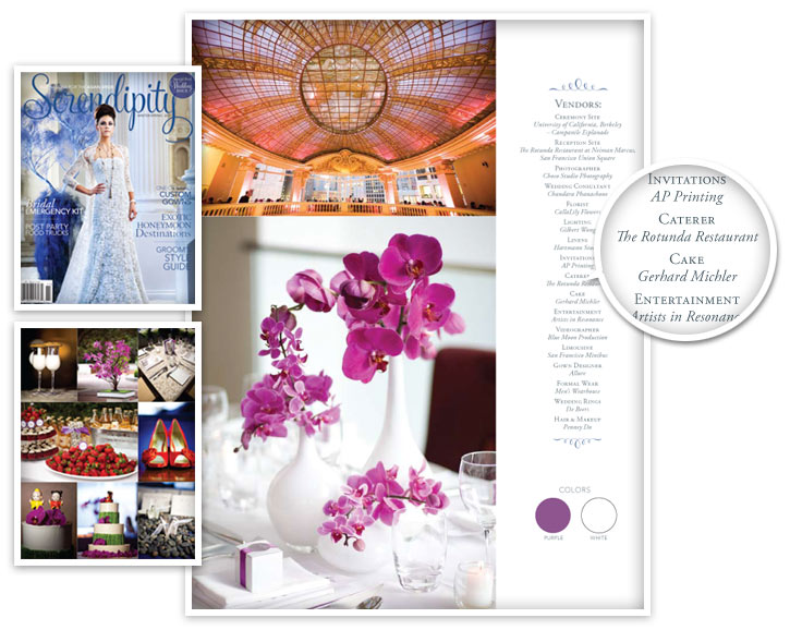 Congratulations to our clients Megan and Albert on their recent marriage and for having their San Francisco wedding featured in the Winter/Spring 2011 issue of Serendipity Magazine. Thank you for choosing Gerhard Michler to make your wedding cake for this very special and spectacular event!